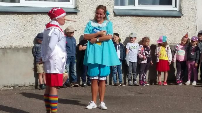 Первый день нового учебного года в детском саду прошел очень весело и интересно. С раннего утра звучала веселая музыка, создавая праздничное настроение. В 11 часов дети собрались на площадке перед детским садом и праздник продолжился. Дети играли в различные веселые игры, танцевали, пели, а помогали им Мальвина и Буратино. В конце праздника появился «доктор», который дал хорошие советы, как укреплять здоровье и угостил детей румяными, ароматными яблоками.