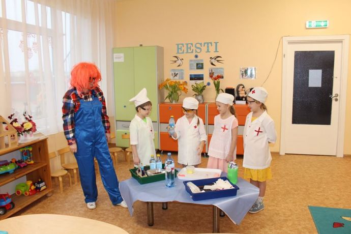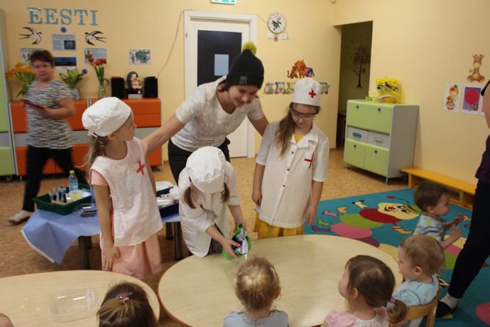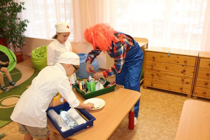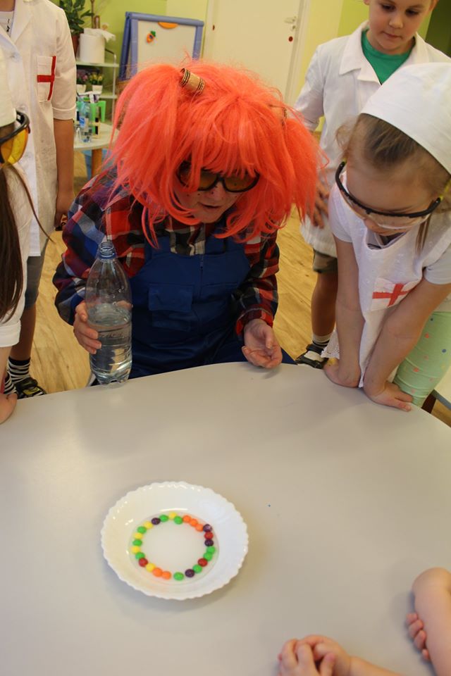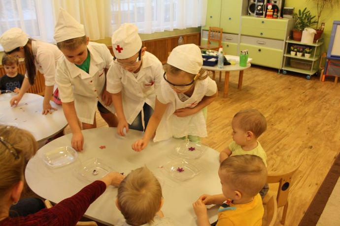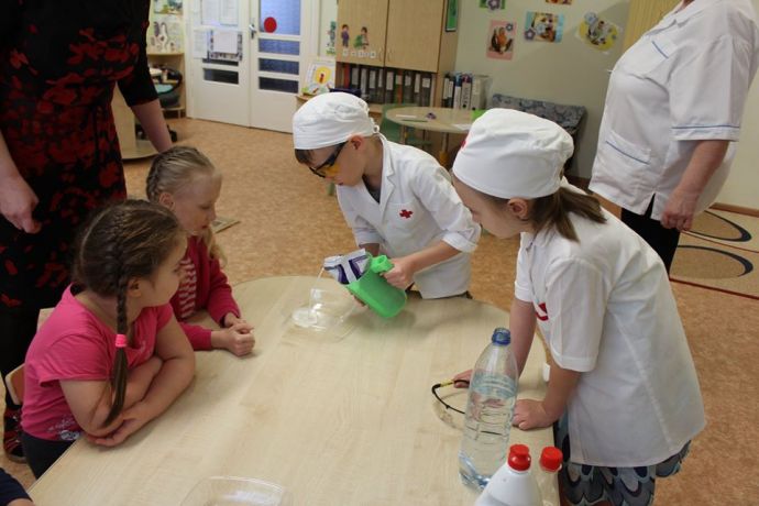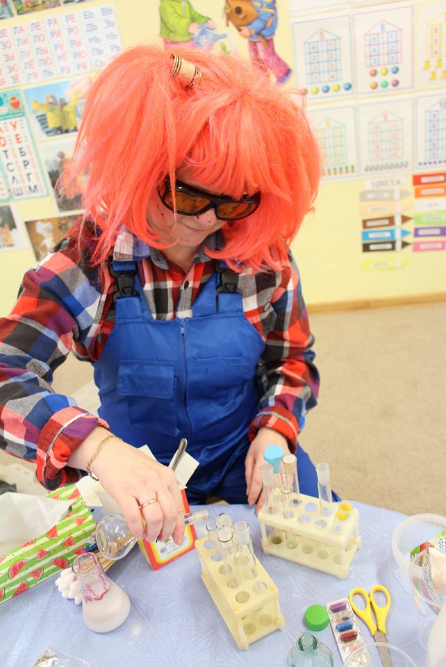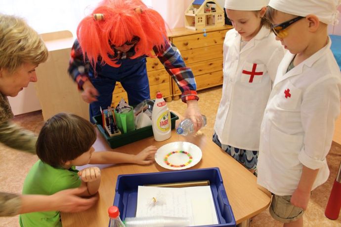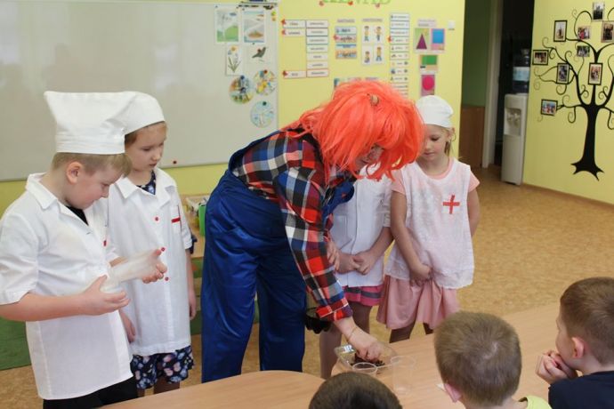 Веснушка и ее помощники в гостях в группе "Пчелка" со своей лабораторией.
