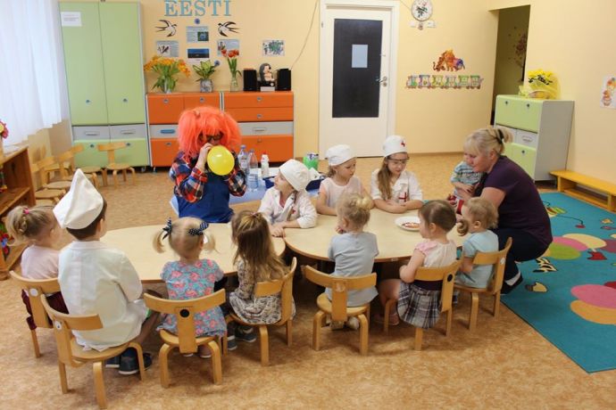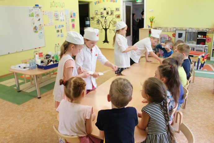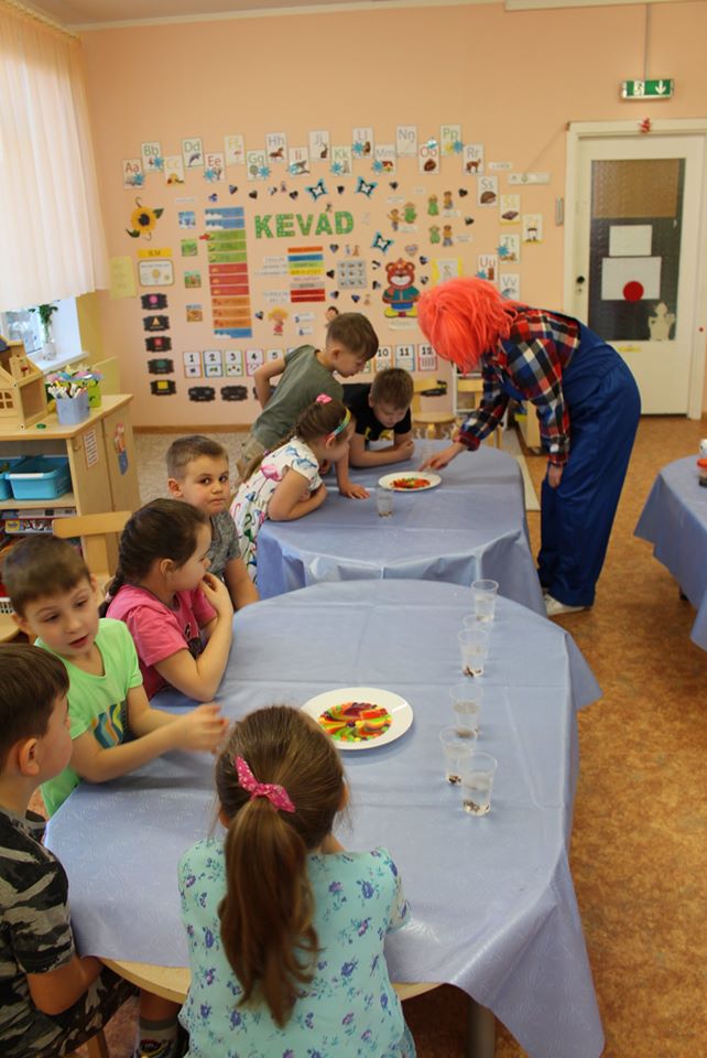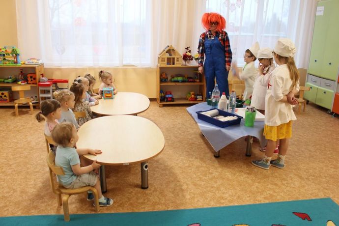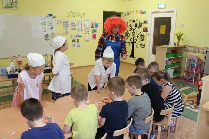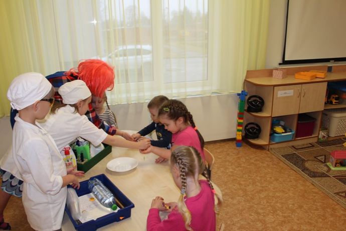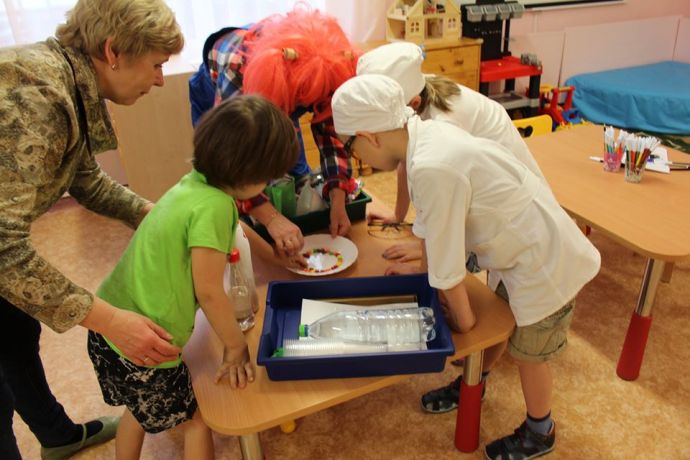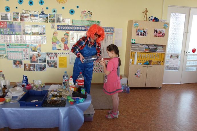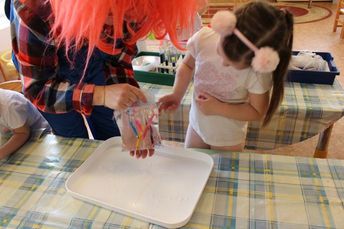Веснушка и ее помощники в гостях в группе "Ромашка" со своей лабораторией.