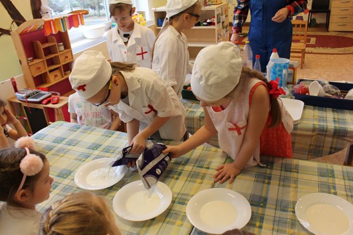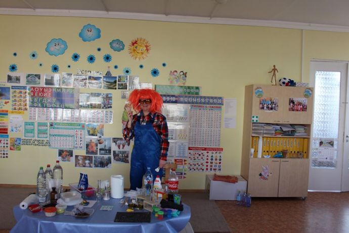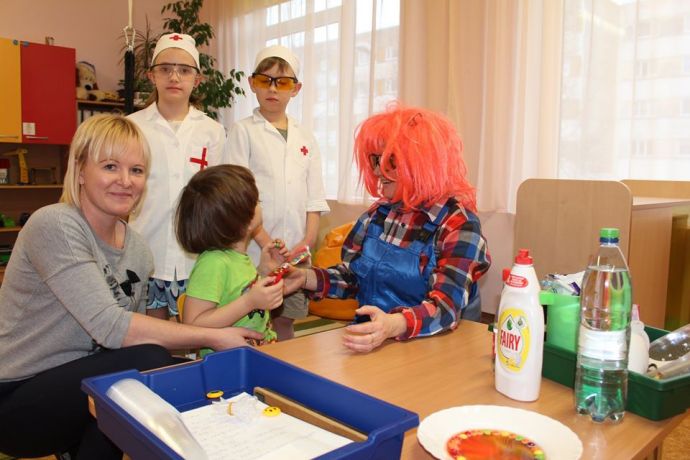 Веснушка и ее помощники в гостях в группе "Утята" со своей лабораторией.