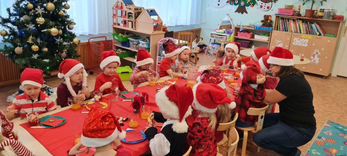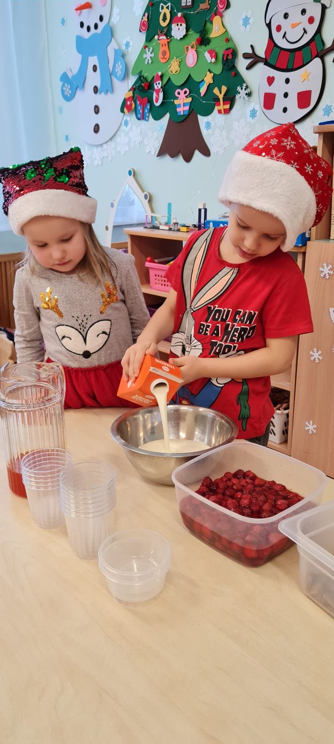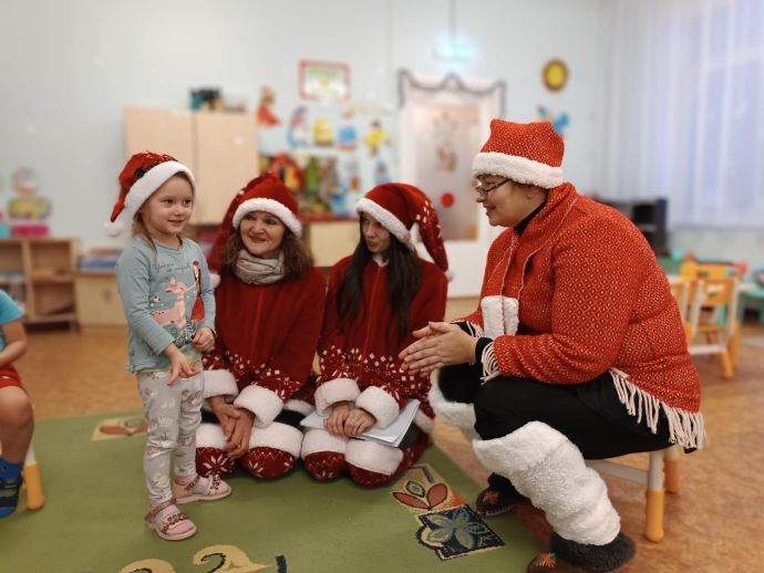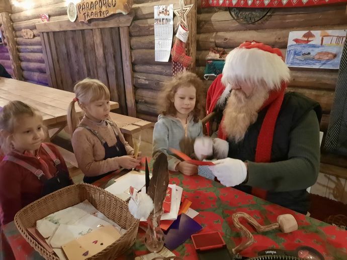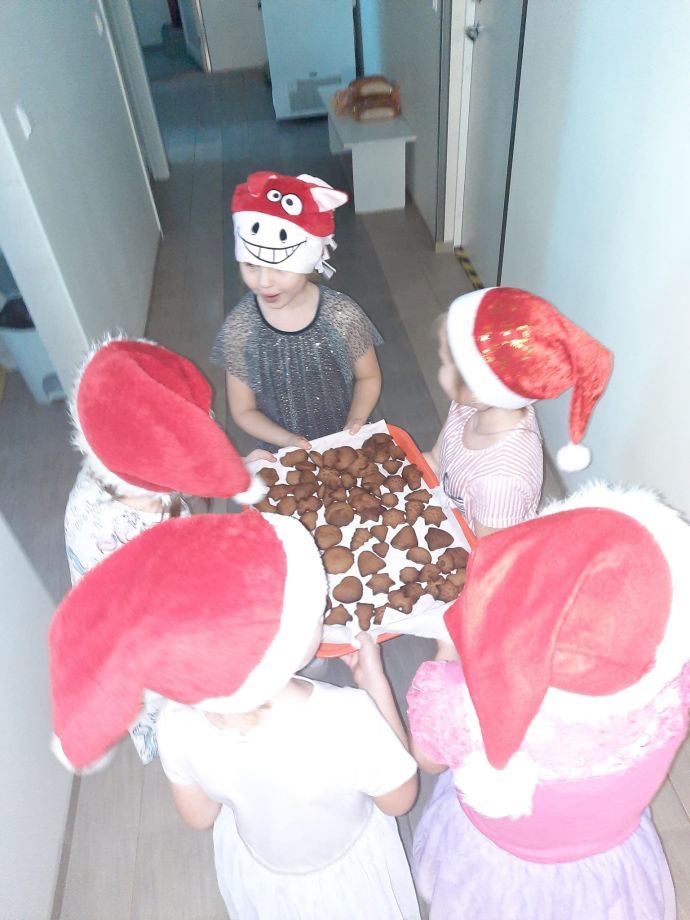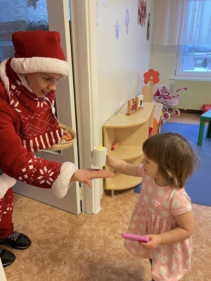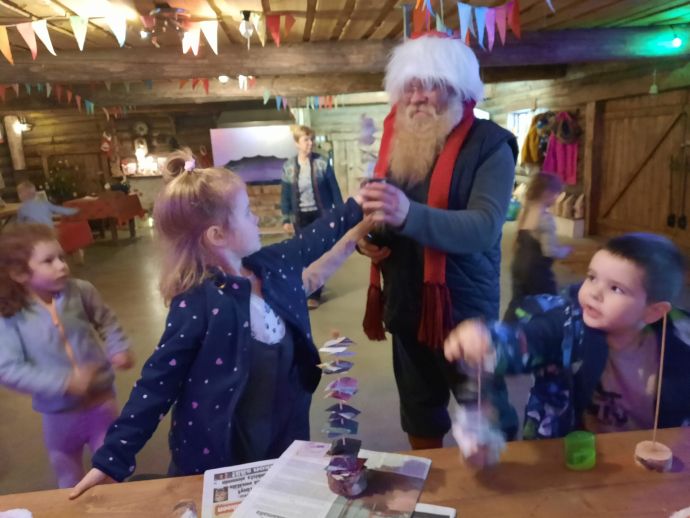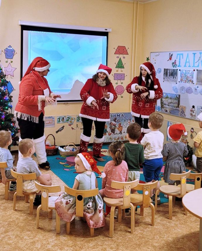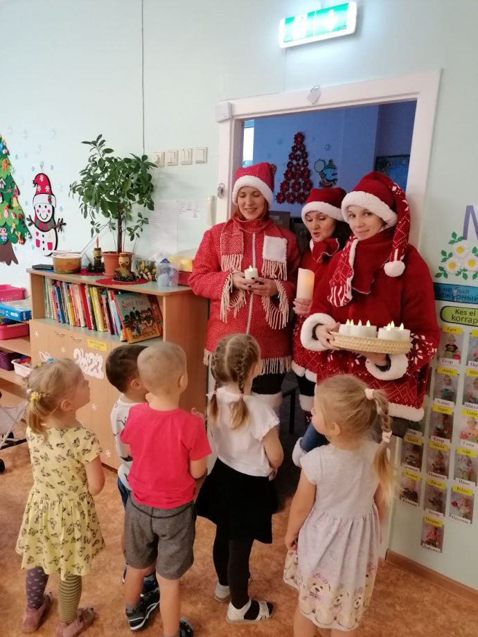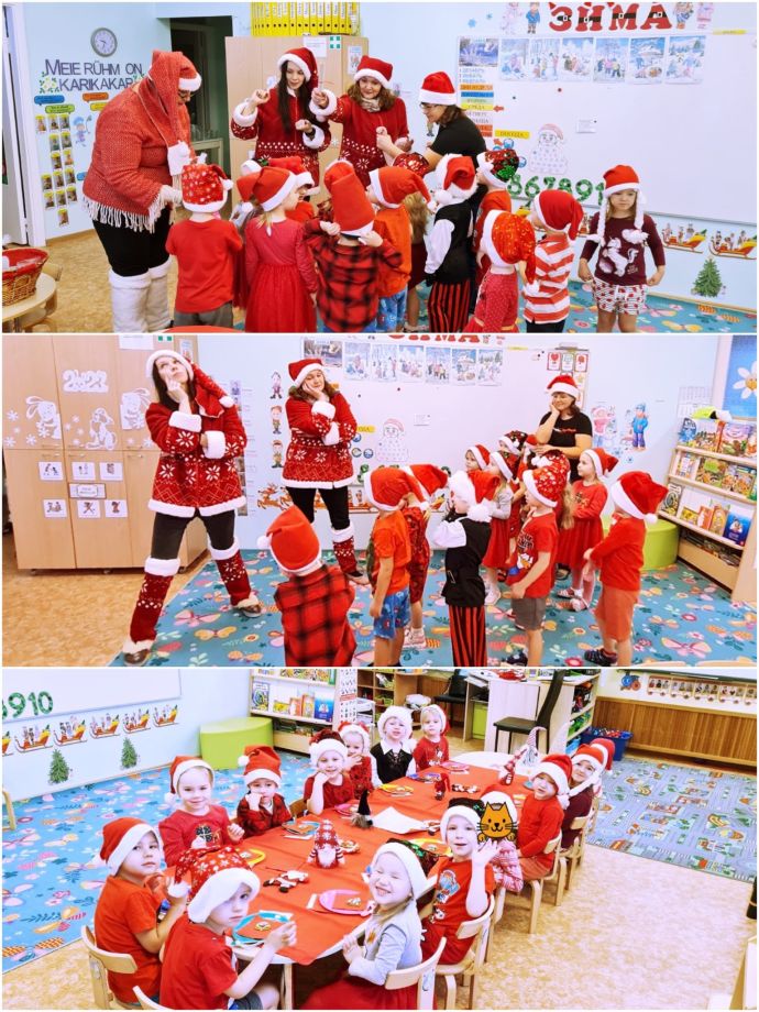 Jõuluvanaga käisid lapsed metsloomadele süüa viimas. Pärast vaatasid jõuluvana majas kaamerast, kuidas loomad toitu sõid. Esimene ülesanne oli teha jõulukaart, kirjutada sisse oma soovid, jõuluvana pani kaardile pitsati ja lapsed panid kaardi postkasti. Edasi küpsetasid lapsed jõuluvana kaminas vorstikesi ja vahukomme. Samuti tegid vahukommidest kooke. Jõuluvana pakkus toidu kõrvale kuuma kakaod ja mahla. Laste järgmine ülesanne oli teha paberist kuusk. Õpetajad tegid kasehalust päkapikud. Lõpuks oli üllatus, jõuluvana sõidutas lapsi oma tehtud sõidukiga. OLI VÄGA TORE!